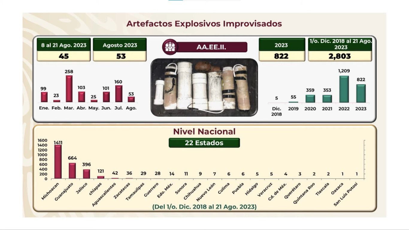 En más del territorio mexicano se ha detectado el uso de artefactos explosivos improvisados (Foto: Captura de pantalla / Gobierno de México)Estados con más aseguramientos de explosivos